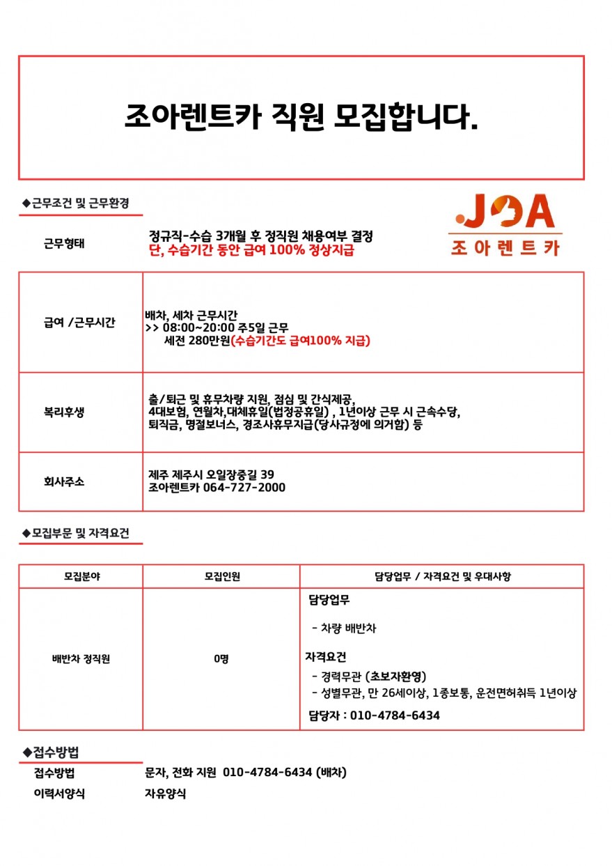 조아렌트카 배반차 정직원 모집합니다. 출퇴근/휴무 차량 지원 페이지 정보 작성자 jOOOOOt 작성일25-02-23 12:50 조회1,411회 연락처 010-4784-6434 급여 월급 : 280만원 관련링크 본문 주소 : 제주특별자치도 제주시 오일장중길 39 조아렌트카 이전글 다음글 목록