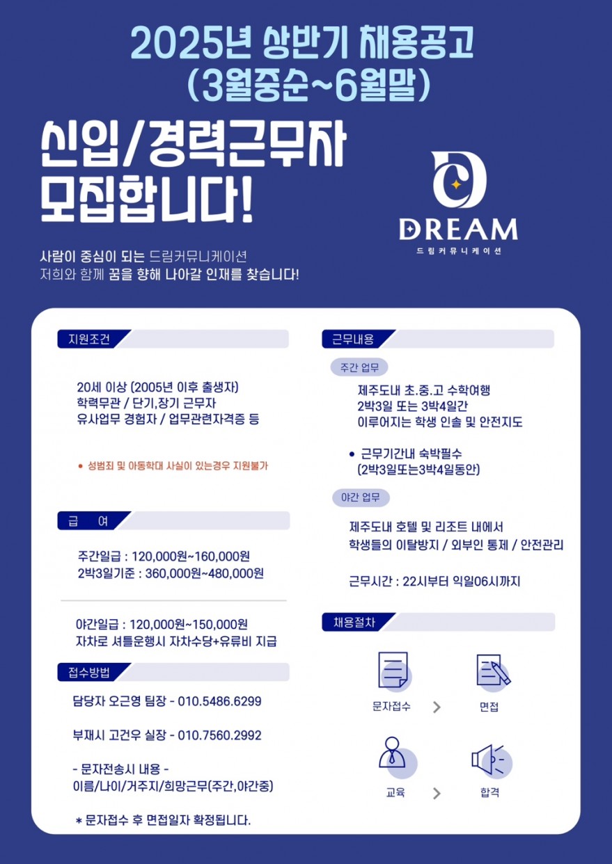 야간업무 : 제주도 호텔 및 리조트 내에서 학생들의 이탈방지 / 외부인통제 / 학생들 신분의 맞지않는 행동 관리감독 및 안전관리 등