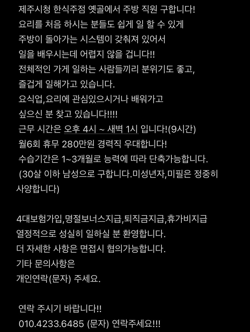 제주시청한식주점옛골에서주방직원구해요!! 페이지 정보 작성자 꼬동 작성일25-09-16 17:09 조회529회 연락처 010-4233-6485 급여 월급 : 2800000 관련링크 본문 . 주소 : 광양8길 1-6 2층 옛골 이전글 다음글 목록