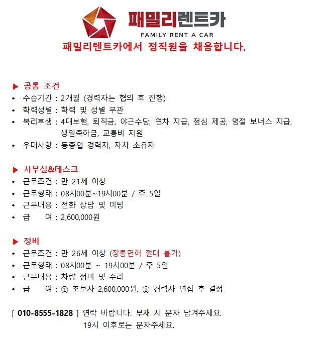 패밀리렌트카 사무실&데스크 구인 페이지 정보 작성자 패OOOO카 작성일25-01-16 17:06 조회2,159회 연락처 010-8555-1828 급여 월급 : 260만 관련링크 본문 연락주세요. 주소 : 제주특별자치도 제주시 제성1길 67 이전글 다음글 목록