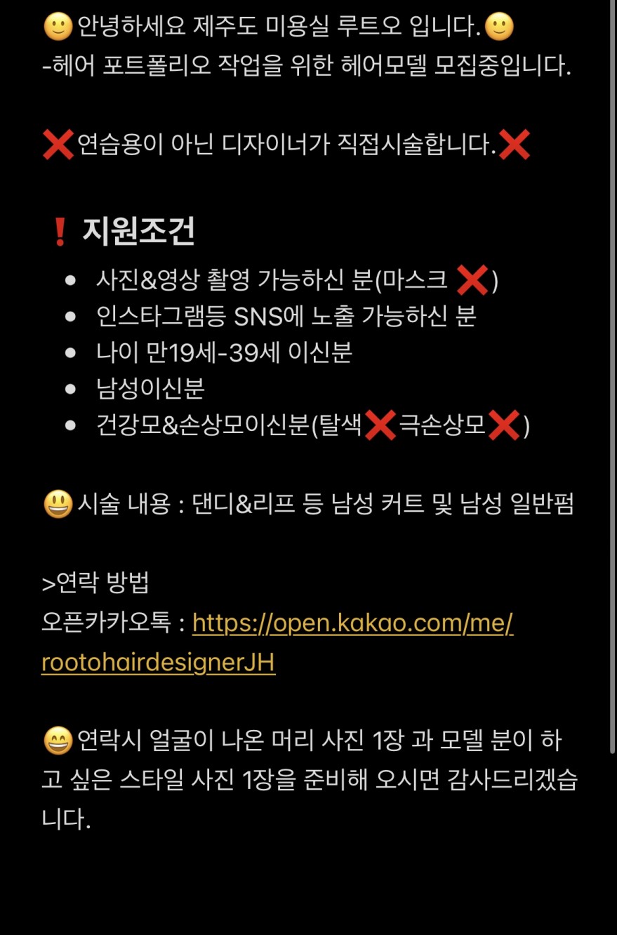 제주시 도남동 미용실 루트오 남자 헤어 모델 구인합니다!! 페이지 정보 작성자 ROOOO 작성일25-01-03 11:18 조회2,455회 연락처 010-3698-9824 급여 협의 : 0 관련링크 본문 오픈카카오톡 : https://open.kakao.com/me/rootohairdesignerJH 주소 : 제주특별자치도 제주시 연삼로 332 루트오헤어 이전글 다음글 목록