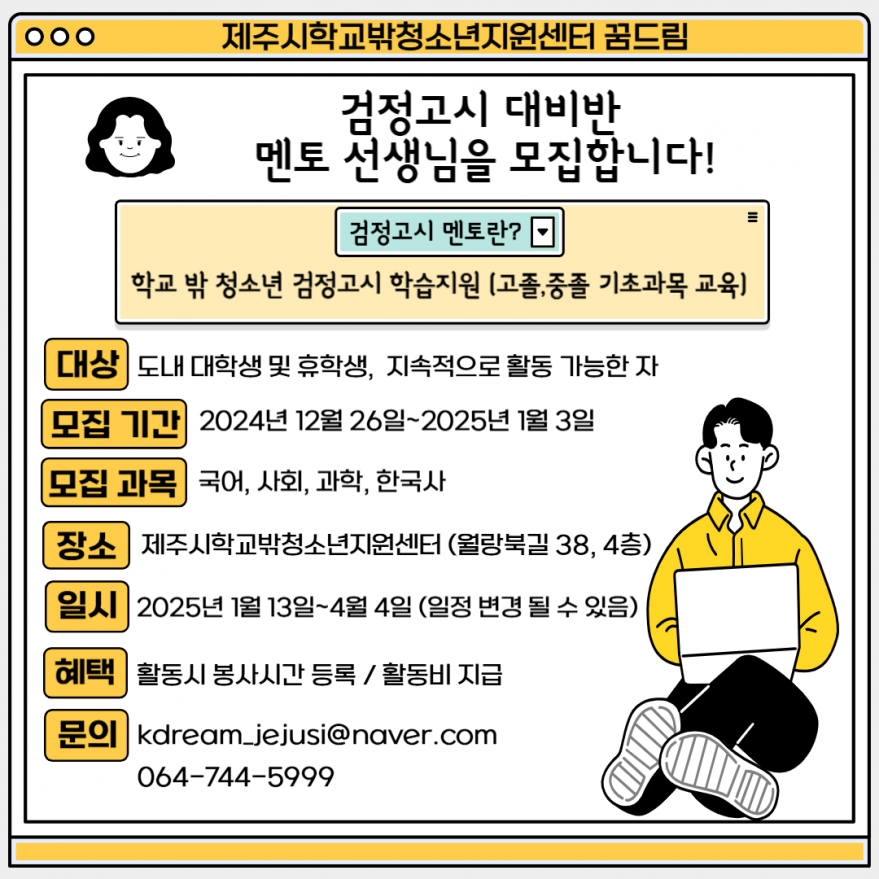 제주시학교밖청소년지원센터에서 검정고시대비반 멘토 선생님을 모집합니다! 페이지 정보 작성자 이O두 작성일24-12-26 09:45 조회2,145회 연락처 010-3047-5884 급여 시급 : 20000 관련링크 본문 *활동지원비는 멘토선생님 소정의 교통비로시간 당 20000원이 아니라는점 참고 부탁드립니다 !!제주시학교밖청소년지원센터에서 검정고시대비반 학습지원 멘토 선생님을 모집합니다 ! 주소 : 제주특별자치도 제주시 월랑북길 38 4층 제주시학교밖청소년지원센터 이전글 다음글 목록
