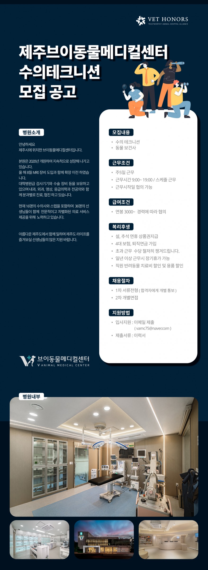 제주시 노형동에 위치한 브이동물메디컬센터에서 수의 테크니션 모집합니다.