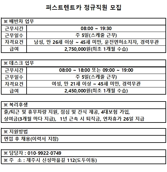 퍼스트렌트카_배반차_및_데스크_직원모집 페이지 정보 작성자 퍼OOz 작성일25-09-11 14:13 조회404회 연락처 010-9922-0749 급여 월급 : 275만원 관련링크 본문 연락바랍니다. 주소 : 제주특별자치도 제주시 신성마을길 112 1층 이전글 다음글 목록