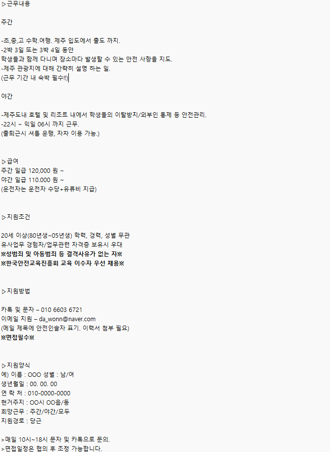 10월_단기_안전지도사_모집 페이지 정보 작성자 dOOOOn 작성일25-09-11 11:02 조회440회 연락처 010-6603-6721 급여 일당 : 120000 관련링크 본문 . 주소 : 제주특별자치도 제주시 삼무로 15 연동태홍누리안3차아파트 204호 이전글 다음글 목록