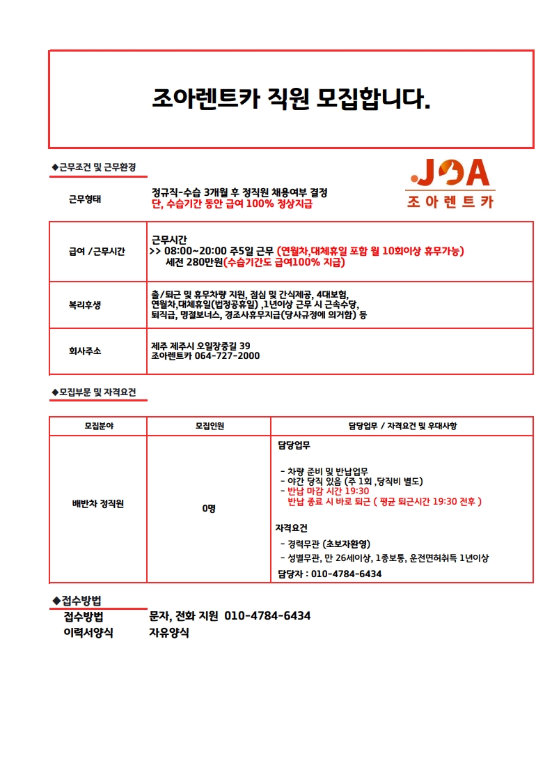 ✧*.◟(ˊᗨˋ)◞.*✧ 조아렌트카 / 출퇴근,휴무차량지원 / 배차 정직원 페이지 정보 작성자 jOOOOa 작성일25-10-09 09:08 조회247회 연락처 010-4784-6434 급여 월급 : 280만원 관련링크 본문 주소 : 제주특별자치도 제주시 오일장중길 39 조아렌트카 이전글 다음글 목록