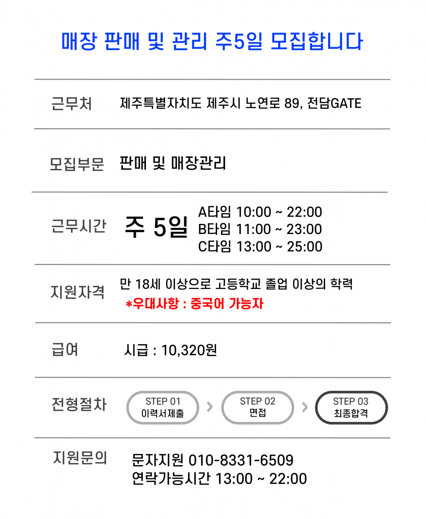 ★★★ 세상에서 제일 쉬운 판매직 직원을 모집합니다 ★★★ 페이지 정보 작성자 곽O식 작성일25-11-27 18:21 조회15회 연락처 010-8331-6509 급여 시급 : 10,320 관련링크 본문 ■ 주업무 : 고객이 물건 선택하면 결제 후 봉투에 담아드리기. 외워야 할 내용 거의 없음. ■ 근무지 : 연동 주소 : 제주특별자치도 제주시 노연로 89 1층 전담GATE 이전글 다음글 목록