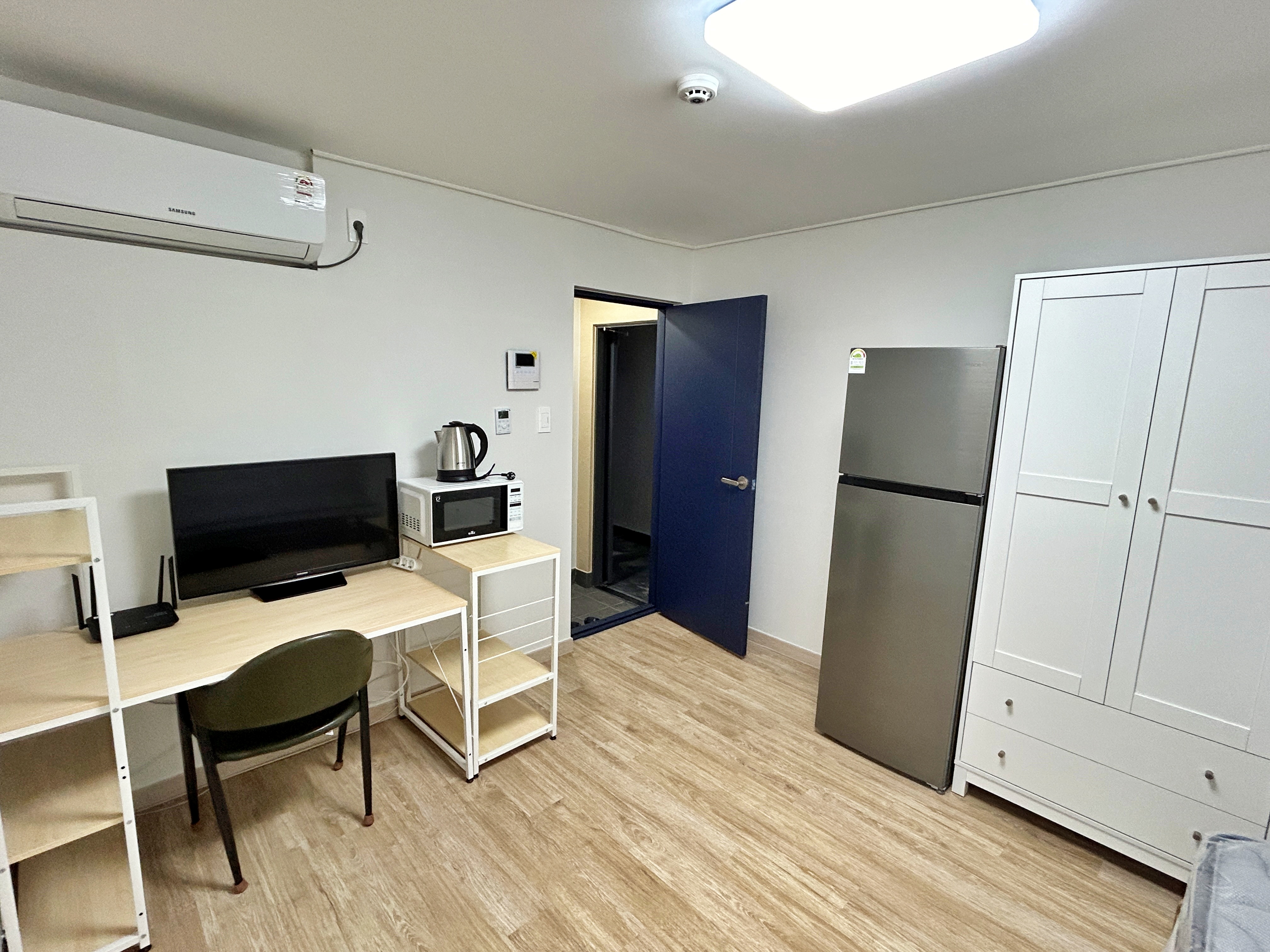 넓은 방과 화장실, 개인 신발장 공간까지 갖췄습니다. 방마다 풀옵션에 전자레인지, TV, 개인 냉장고, 와이파이(5G) 구비되어 있습니다.