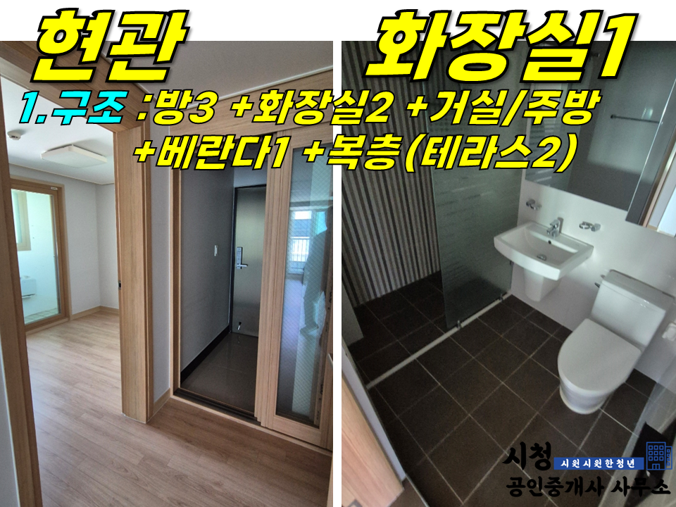 ■구조 :방3 +화장실2 +거실/주방 +베란다1(세탁실) +넓은 복층(복층 내 테라스2)