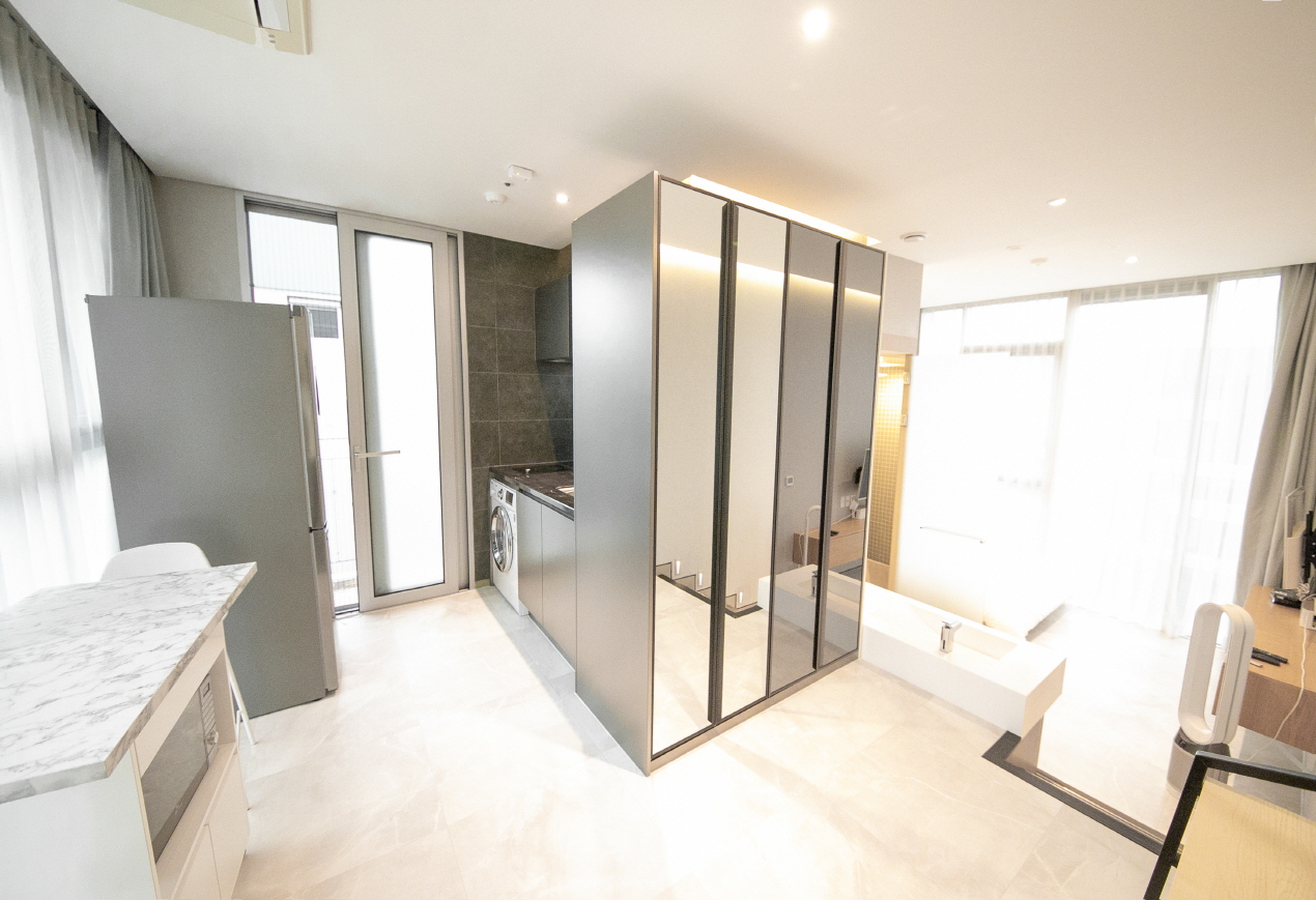 옵션: 이동형 아일랜드식탁, 의자2개, 다이슨공기청정기, 청소기, 전자레인지, 침대, 호텔형 기본침구, 붙박이장2개, 드럼세탁기, TV, 인덕션, 냉장고, WIFI, 천장형 시스템 냉온풍기, 모기퇴치기, 신발장, 침실협탁, 무드등, 기본식기 (욕실,주방은 하츠와 아메리칸스탠다드 브랜드로 설치되어 있음)