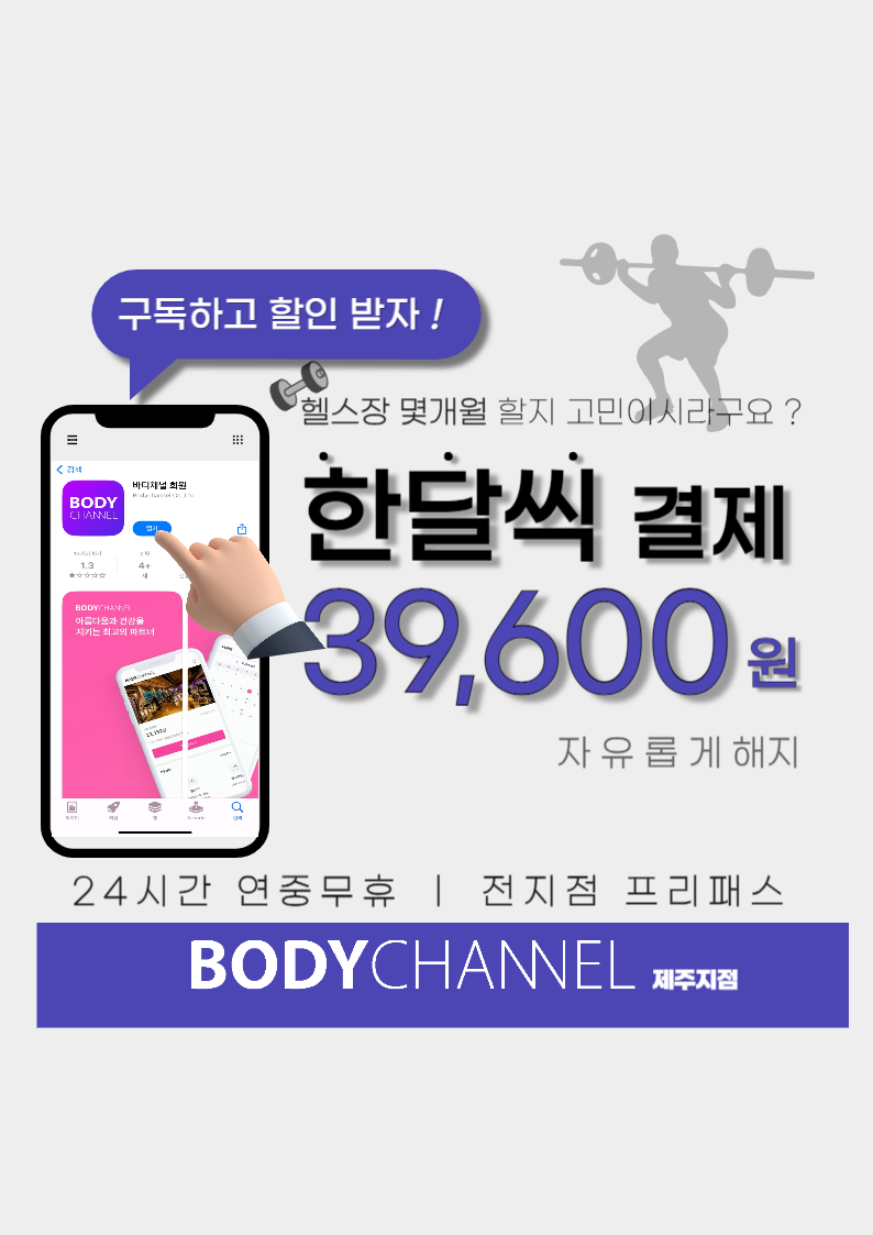 기타 | 바디채널휘트니스 월정기결제(구독) 서비스 오픈!! 페이지 정보 작성자 wOOOOd 작성일24-10-15 16:03 조회8,555회 연락처 010-6848-7662 관련링크 본문 이제는 헬스도 몇개월 할지 고민하지말고월39,600원으로 합리적인 금액으로 정기구독으로 이용하고 자유롭게 해지도 가능!※바디채널 앱에서 구독상품 결제 가능!! 이전글 다음글 목록