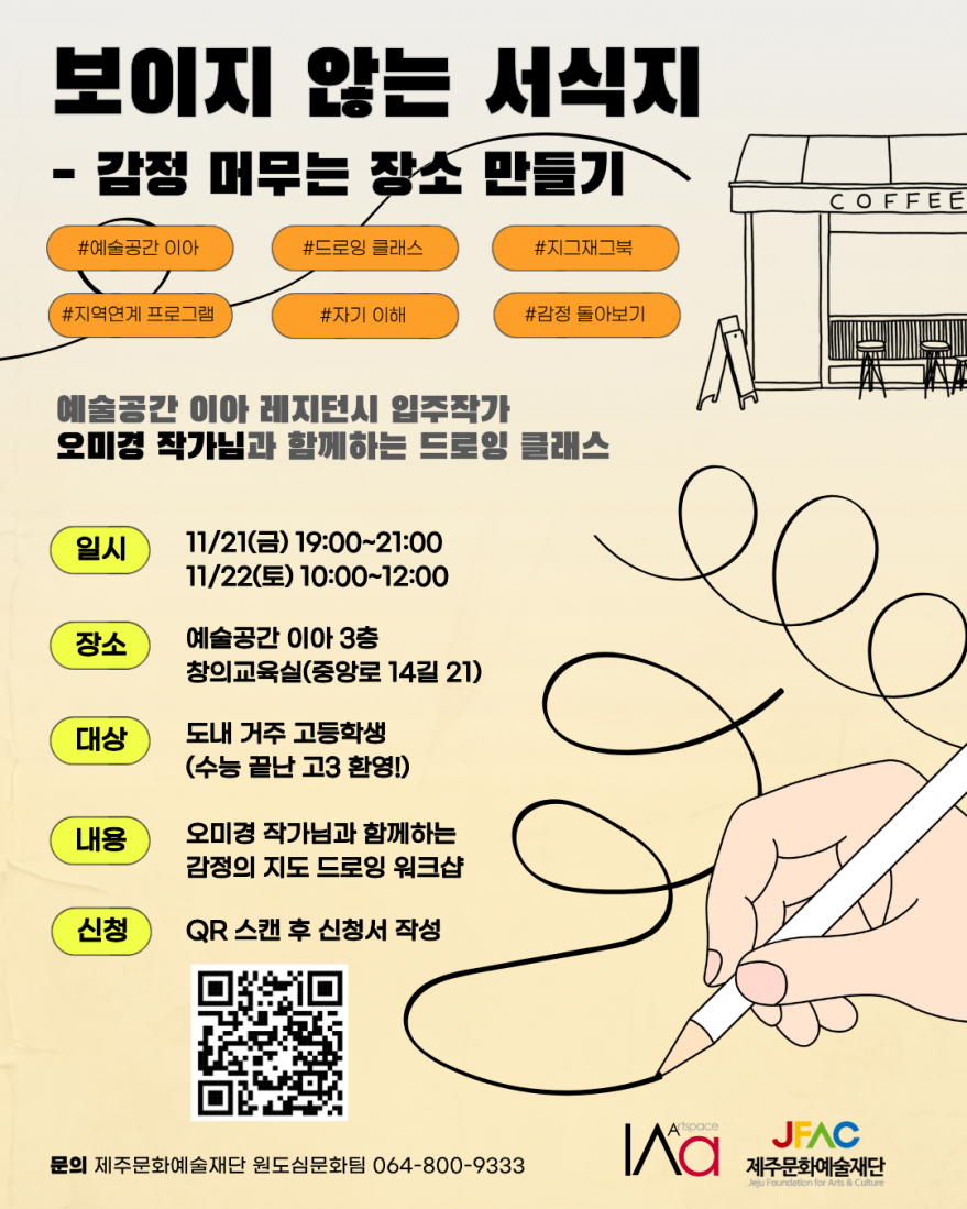 기타 | 예술공간_이아_지역연계_프로그램<보이지_않는_서식지-감정_머무는_장소_만들기>드로잉_클래스_참여자_모집 페이지 정보 작성자 이바 작성일25-11-15 11:22 조회74회 연락처 010-000-0000 관련링크 본문 세부사항홈페이지참고https://www.jfac.kr/notification/notice/19589?page=1 다음글 목록