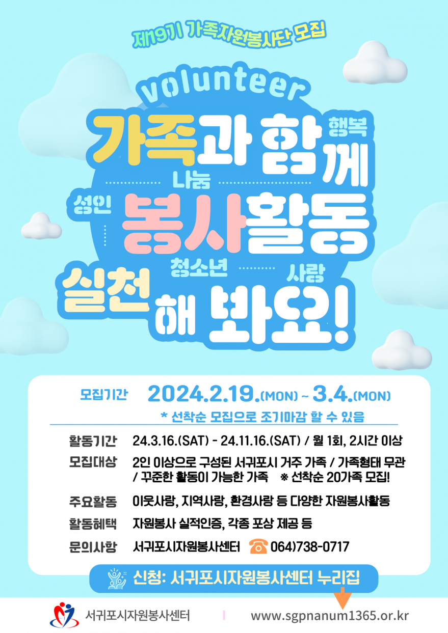 기타 | 제19기 가족자원봉사단 모집 페이지 정보 작성자 서OOOOOOOO터 작성일24-02-21 10:50 조회6,382회 연락처 010-738-0717 관련링크 본문 서귀포시자원봉사센터에서'제19기 가족자원봉사단'을 모집합니다!많은 참여 부탁드립니다! 이전글 다음글 목록