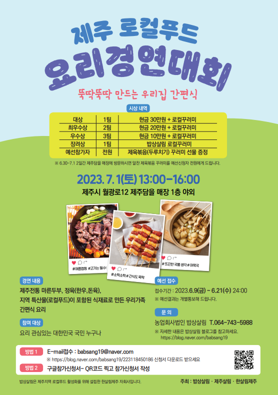 기타 | 제주 로컬푸드 경연대회 7월1일 개최합니다. 페이지 정보 작성자 sOOOOOo 작성일23-06-14 13:11 조회7,468회 연락처 010-9224-1979 관련링크 본문 밥상살림이 주최하는 요리경연대회가 7.1(토) 1300-1600 한살림-제주담을 매장에서 개최됩니다. 제주로컬 푸드를 알리고자 하는 좋은 취지의 대회입니다. 많은 참여 부탁드립니다. 문의는 064-743-5988.. 이전글 다음글 목록