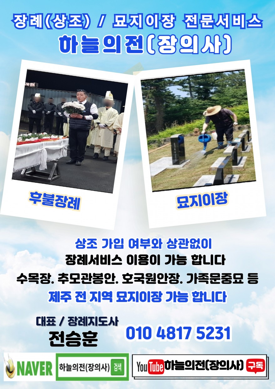 기타 | ★★제주묘지이장전문 하늘의전(장의사) ★★ 페이지 정보 작성자 하OO전 작성일25-04-30 15:22 조회5,511회 연락처 010-4817-5231 관련링크 본문 #제주도수목형이장 #제주도평장 #제주도가족묘지조성 #제주묘지이장후절에모시기#제주도추모공원(납골당)봉안 #제주도호국원 #제주도무연묘지처리#제주도묘지이장다른지역가기 선택하시는 유형으로 묘지이장이 가능합니다! 이전글 다음글 목록