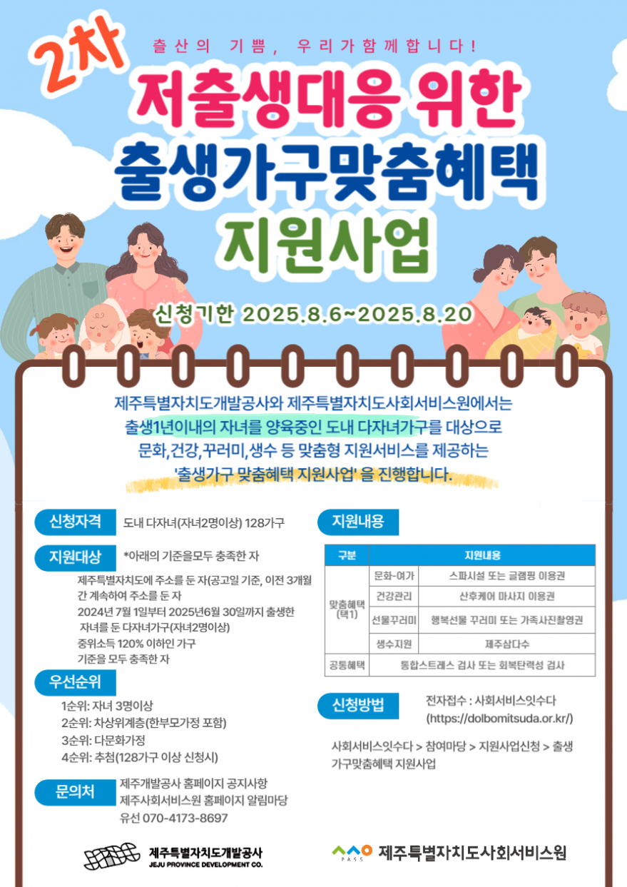 저출생대응 위한 [출생가구 맞춤혜택 지원사업]을 제주특별자치도개발공사와 제주특별자치도사회서비스원이 협력하여, 출생 가정을 위한 지원사업을 진행합니다.