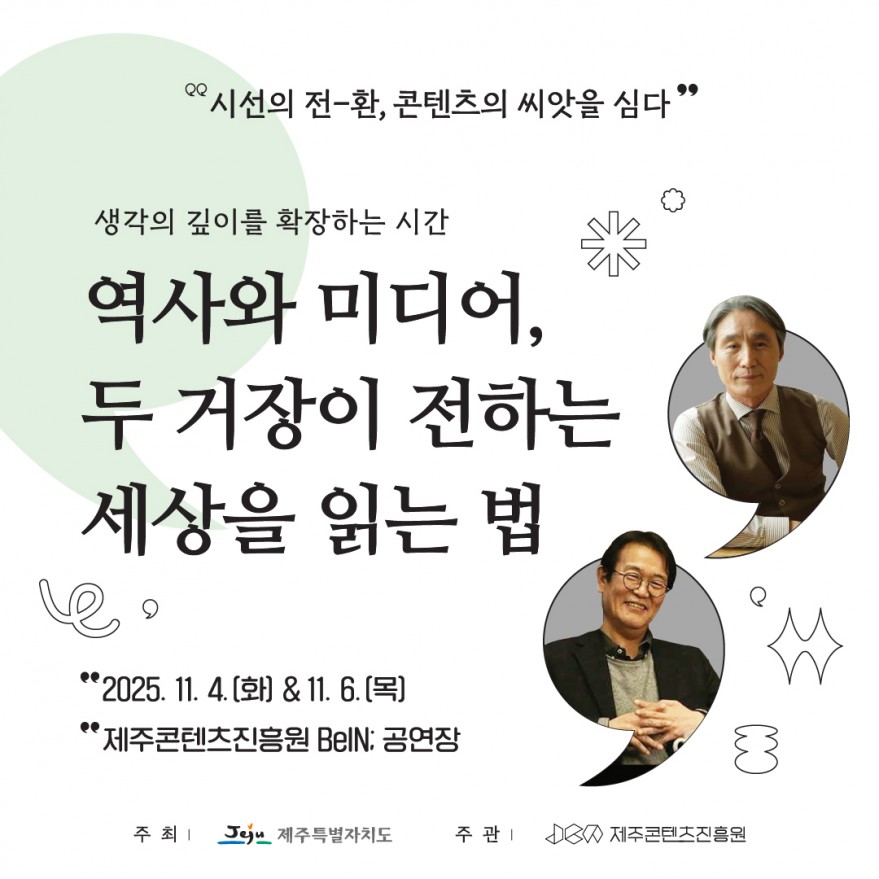 [제주콘텐츠진흥원]역사와미디어,두거장이전하는세상읽는법!(~11/5,수) 페이지 정보 작성자 함OO면 작성일25-10-24 12:37 조회199회 연락처 010-1234-5678 관련링크 본문 신청바로가기 자세히보기 이전글 다음글 목록