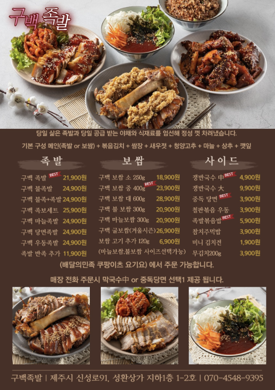 구백족발 제주시점 KCCI 제주족발부분 우수 매장선정 페이지 정보 작성자 구OO발 작성일25-03-22 20:42 조회4,237회 연락처 010-1121-1231 관련링크 본문 21900원에 족발 한족을 드실수 있습니다!! 배달의민족 쿠팡이츠 요기요 등등 에서 주문 가능하니 언제든 편하게 주문 주세요!! 이전글 다음글 목록
