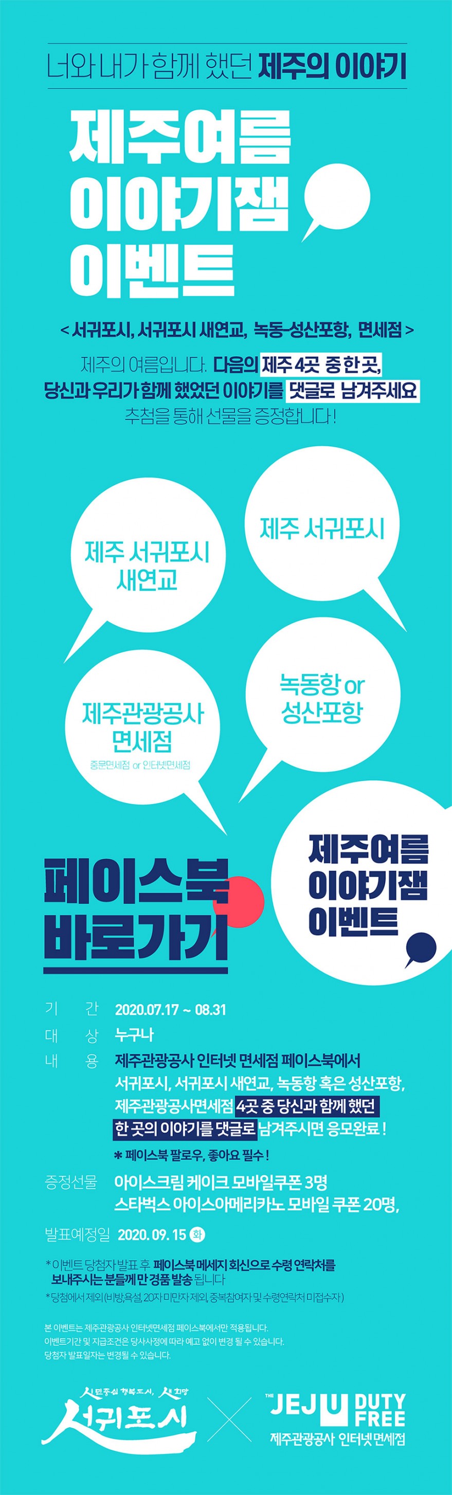 - 내용 : 제주관광공사 인터넷 면세점 페이스북에서 서귀포시, 서귀포시 새연교, 녹동항 혹은 성산포항, 제주관광공사면세점 4곳 중 당신과 함께 했던한 곳의 이야기를 댓글로 남겨주시면 응모완료 !