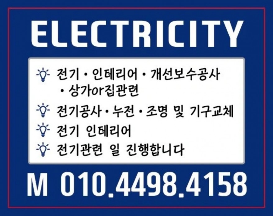 전기공사 페이지 정보 작성자 기니 작성일20-05-07 12:04 조회6,652회 연락처 010-4498-4158 관련링크 본문 ⚡️전기•인테리어•개선보수공사•상가or집관련 ⚡️전기공사•누전•조명 및 기구교체 ⚡️전기 인테리어⚡️분전함 교체 등 전기관련 일 진행합니다 이전글 다음글 목록