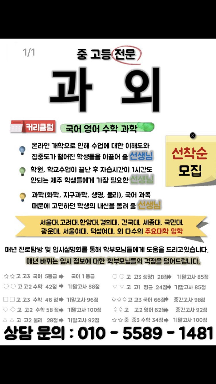 서울권에서 5년간 수업했고, 수학 ,과학 과목 뿐