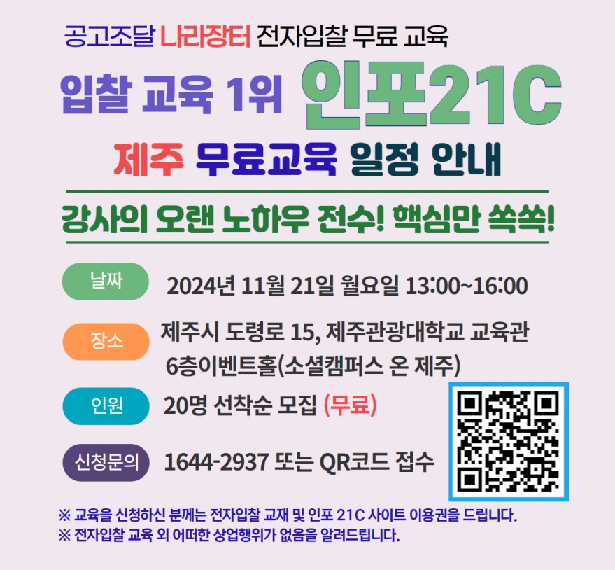 평소 공공조달에 관심이 있으신 분께서는 이번 제주에서 하는 무료교육 놓치지 마시고 신청해주세요.