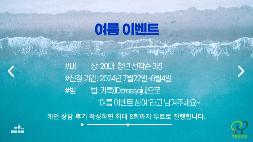 트리즈심리상담센터 제주시지점 "여름 이벤트" 페이지 정보 작성자 아OO성 작성일24-07-23 14:48 조회4,577회 연락처 010-8029-9838 관련링크 본문 트리즈심리상담센터 제주시지점 "여름 이벤트" 진행합니다. 20대 청년들 참여하세요~ 트리즈심리상담센터 제주시지점주소: 제주시 오복1길 아이비하우스 305호연락처: 010-8029-9838카톡ID: treesjeju 이전글 다음글 목록