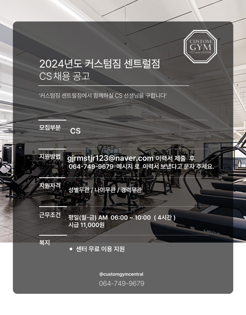 커스텀짐센트럴점에서 새롭게 함께하실 CS선생님을 구합니다 페이지 정보 작성자 안O영 작성일24-06-18 17:00 조회5,172회 연락처 010-5519-7343 관련링크 본문 안녕하세요:)커스텀짐센트럴점입니다. 이력서 제출1. 메일로 이력서 보내주세요.2. 064-749-9679 문자로 이력서 보냈다고 문자 주세요. 많은 관심부탁드려요.주소 : 제주특별자치도 제주시 1100로 3324 3, 4층 커스텀짐 센트럴점 3층 이전글 다음글 목록