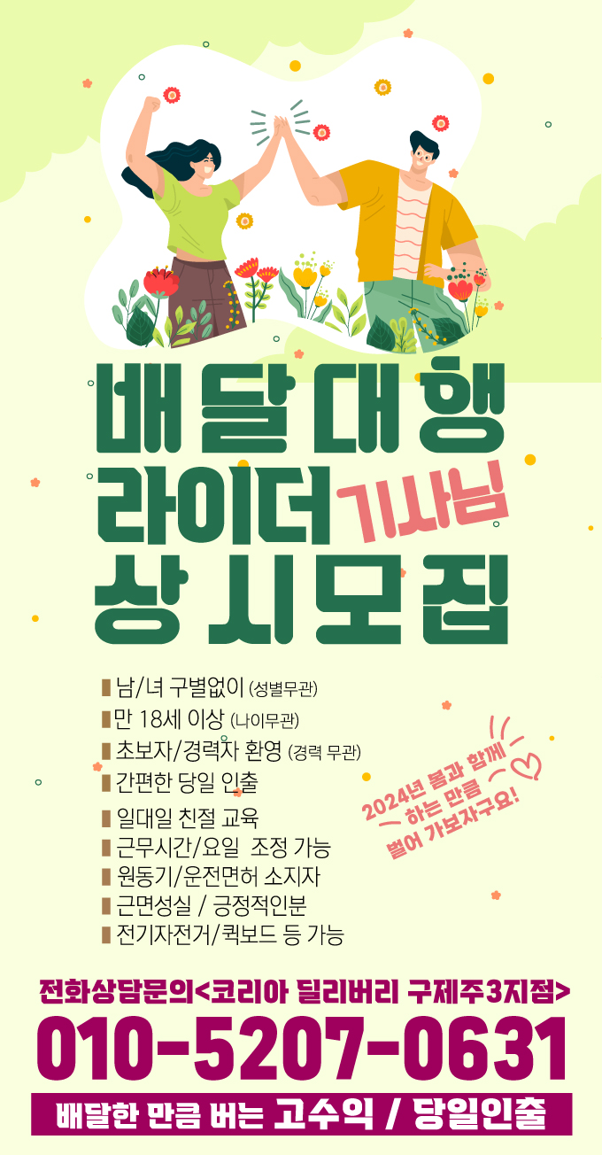 ★★★[구제주]코리아딜리버리/배달/라이더/기사님/모집[남녀구분없이]★★★ 페이지 정보 작성자 배달 작성일24-03-04 21:23 조회5,139회 연락처 010-5207-0631 관련링크 본문 [구제주] 에서 함께 배달일 할 기사님 모집합니다.성별 상관없이 초보자도 가능하니 편하게 연락하고상담 받아 보세요 이전글 다음글 목록