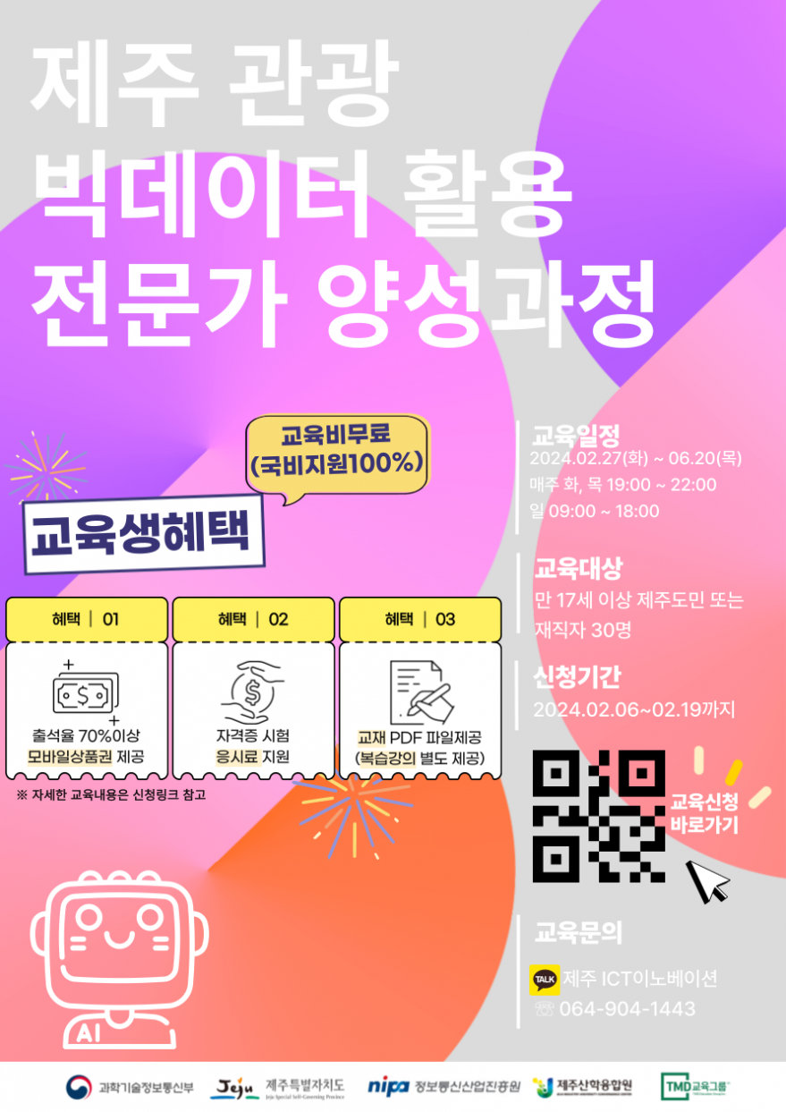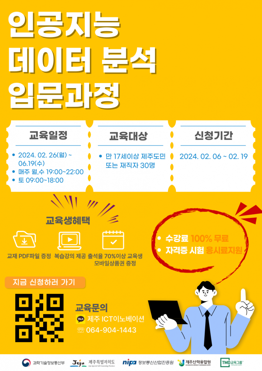 [무료교육] 인공지능, 데이터 분야 교육생 모집 페이지 정보 작성자 제OOOOOOOO국 작성일24-02-07 16:28 조회4,625회 연락처 010-5509-1301 관련링크 본문 2024 제주 ICT이노베이션 운영사무국입니다.인공지능과 데이터 시대를 주도해, 각 분야의 전문가로 성장할 절호의 기회!지금 바로 교육 신청하세요!상세 내용은 포스터 참고 바랍니다. 이전글 다음글 목록