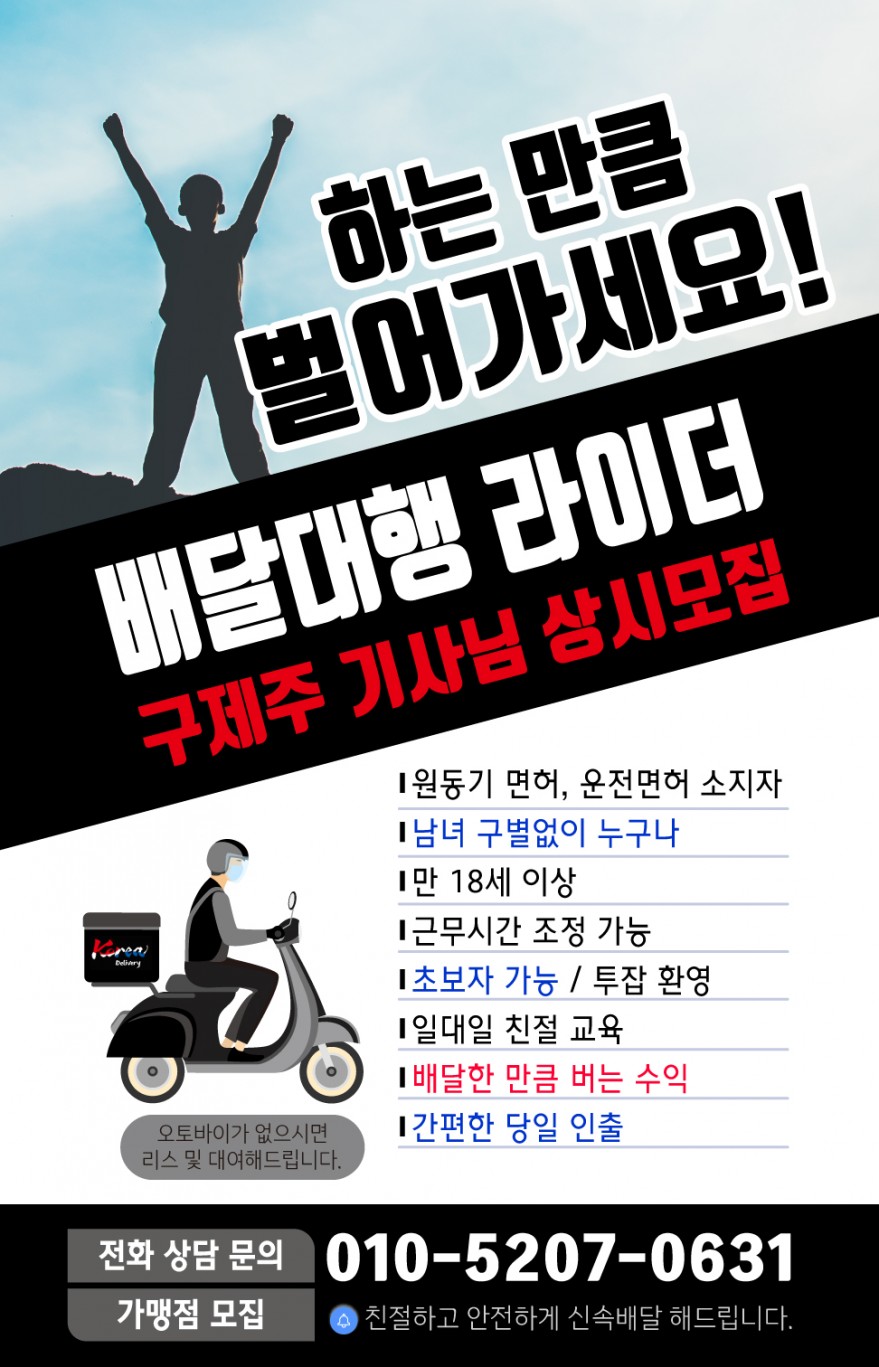 [구제주] 라이더 기사님 모집 [남녀구분없이] 페이지 정보 작성자 코OOOOO리 작성일24-01-20 10:12 조회5,110회 연락처 010-5207-0631 관련링크 본문 [구제주] 에서 함께 배달일 할 기사님 모집합니다.성별 상관없이 초보자도 가능하니 편하게 연락하고상담 받아 보세요 이전글 다음글 목록