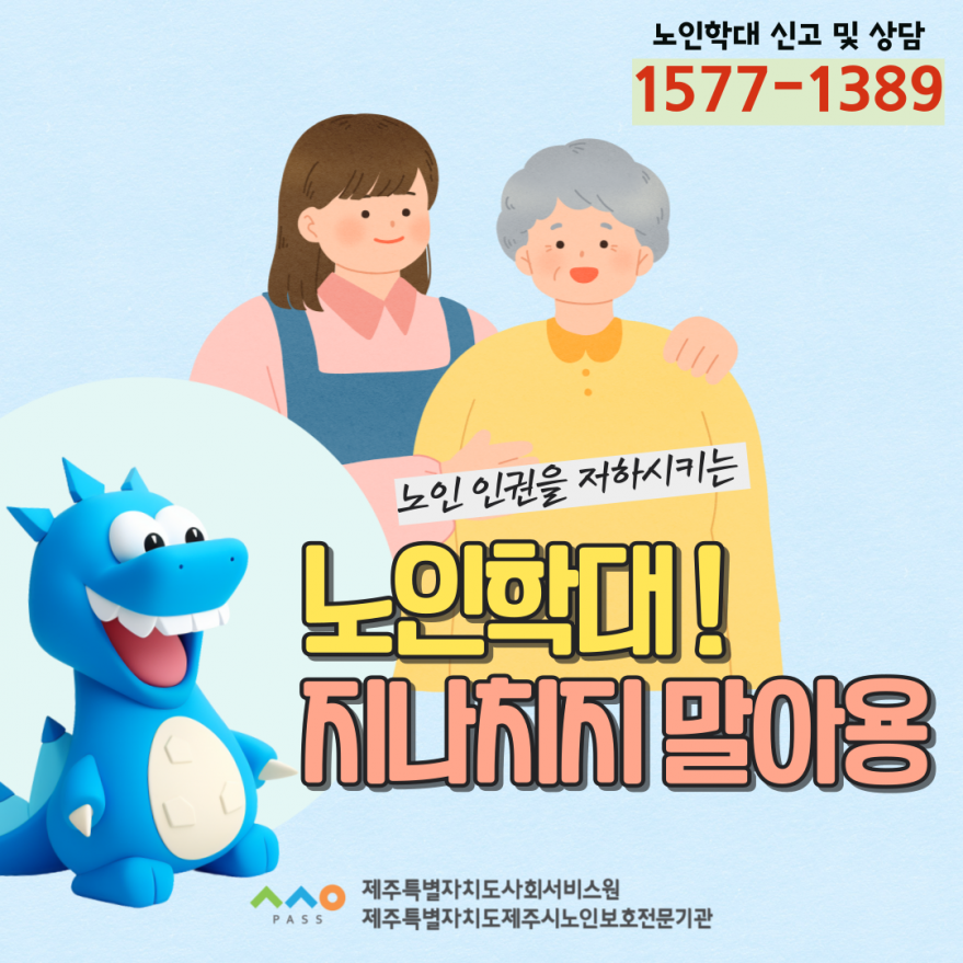 [제주특별자치도제주시노인보호전문기관] 1월 노인학대 예방 포스터 페이지 정보 작성자 제OOOOOOOOO관 작성일24-01-05 16:27 조회5,077회 연락처 010-4690-1389 관련링크 본문 안녕하십니까!제주특별자치도 노인보호전문기관이 '제주특별자치도제주시노인보호전문기관'으로 명칭 변경되었습니다.바뀐 기관명도 꼭 기억해주시고 앞으로도 많은 관심 부탁드립니다!갑진년, 새해 복 많이 받으세요:)노인학대 신고 및 상담 1577-1389 이전글 다음글 목록