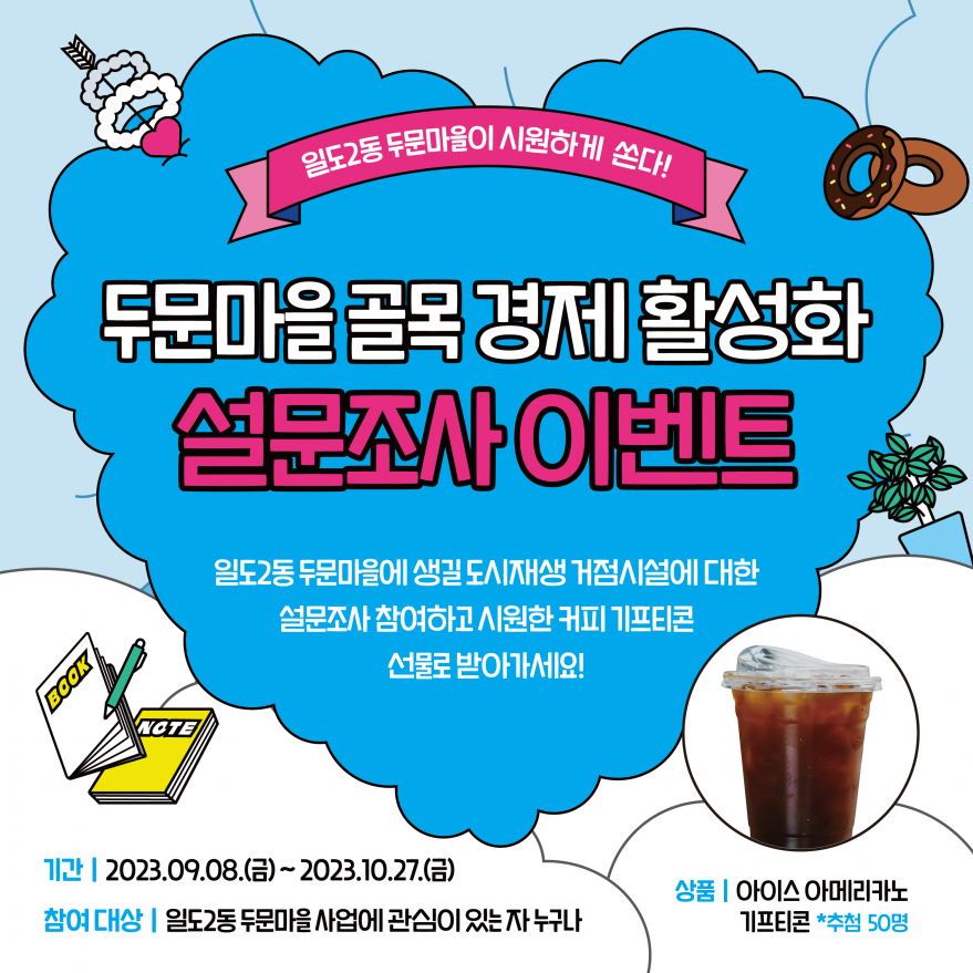 ✨일도2동 두문이마을 골목경제 활성화 설문조사 이벤트✨ 페이지 정보 작성자 iOOOOOOOu 작성일23-09-18 13:00 조회4,512회 연락처 010-0000-0000 관련링크 본문 이전글 다음글 목록