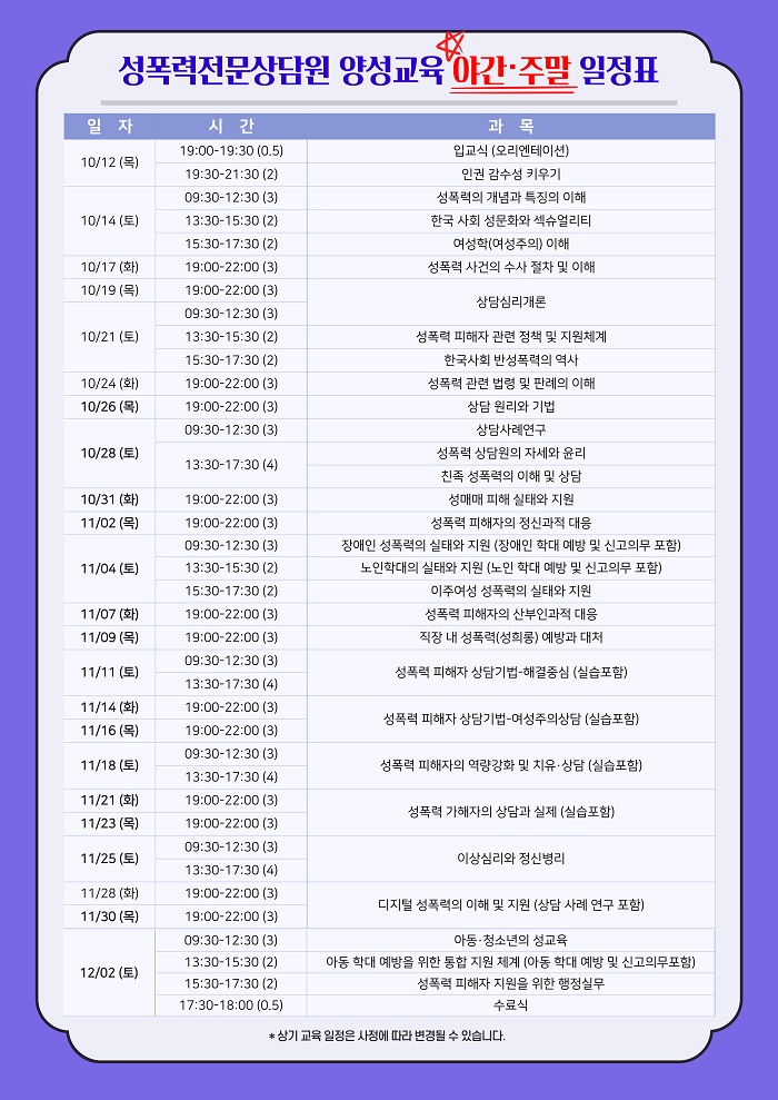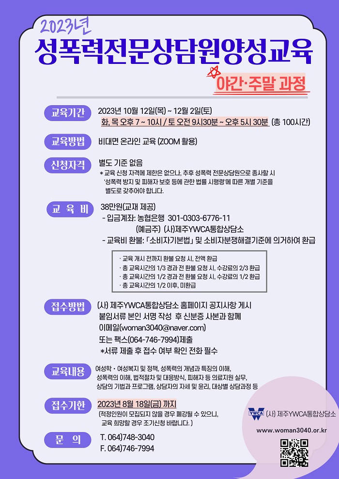 성폭력전문상담원 양성교육 야간·주말과정 교육생 모집 페이지 정보 작성자 제OOOOOOOOO소 작성일23-06-26 11:52 조회4,502회 연락처 010-2389-7654 관련링크 본문 2023년 성폭력전문상담원 양성교육 야간·주말과정 (사)제주YWCA통합상담소에서는 성폭력 피해자 상담 지원을 위한 성폭력전문상담원 양성교육을 실시합니다. 제주YWCA통합상담소 공지사항의 붙임 내용 참고하시어 많은 신청 바랍니다. 이전글 다음글 목록