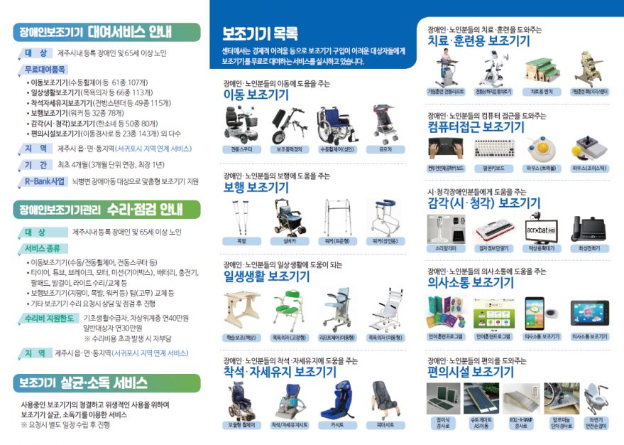 센터에서는 신체 능력에 따라 필요한 보조기기를 일상생활 및 학교, 직장 등에서 활용할 수 있도록 제주시 내 등록 장애인 및 65세 이상 노인에게 무료로 대여해드리고 있습니다.