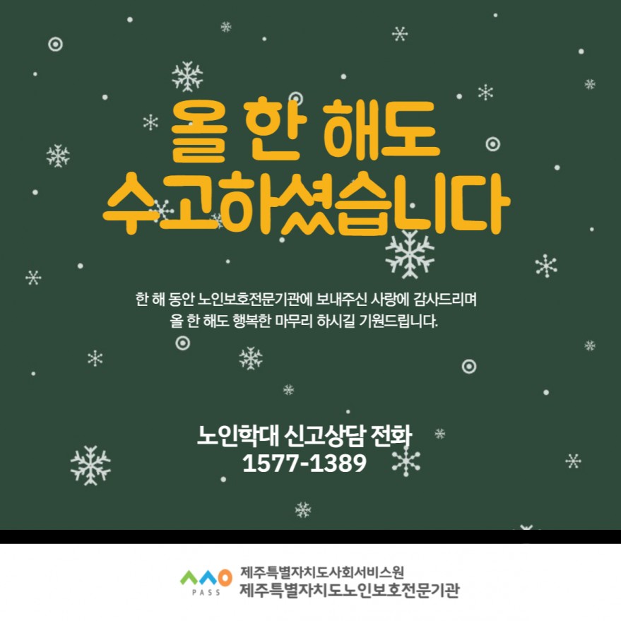 [제주특별자치도노인보호전문기관] 올 한 해도 수고하셨습니다. 페이지 정보 작성자 제OO보 작성일22-12-30 08:57 조회4,721회 연락처 010---- 관련링크 본문 올 한 해도 수고하셨습니다. 이전글 다음글 목록