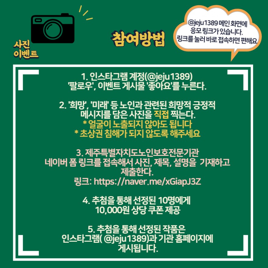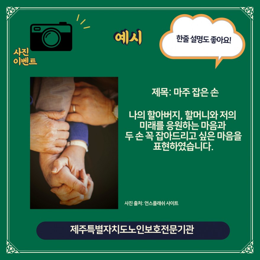 사진 한 장 찍고 주제(노인 관련)에 맞게 사진에 대한 제목과 설명을 제주특별자치도노인보호전문기관 네이버 폼으로 올려주시면 됩니다. 어렵게 생각할 필요 없고 가벼운 마음으로 참여해주세요~~