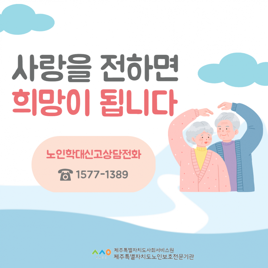 [제주특별자치도노인보호전문기관]사랑을 전하면 희망이 됩니다. 페이지 정보 작성자 제OO보 작성일22-09-26 09:49 조회4,841회 연락처 010-0000-0000 관련링크 본문 사랑을 전하면 희망이 됩니다. 이전글 다음글 목록