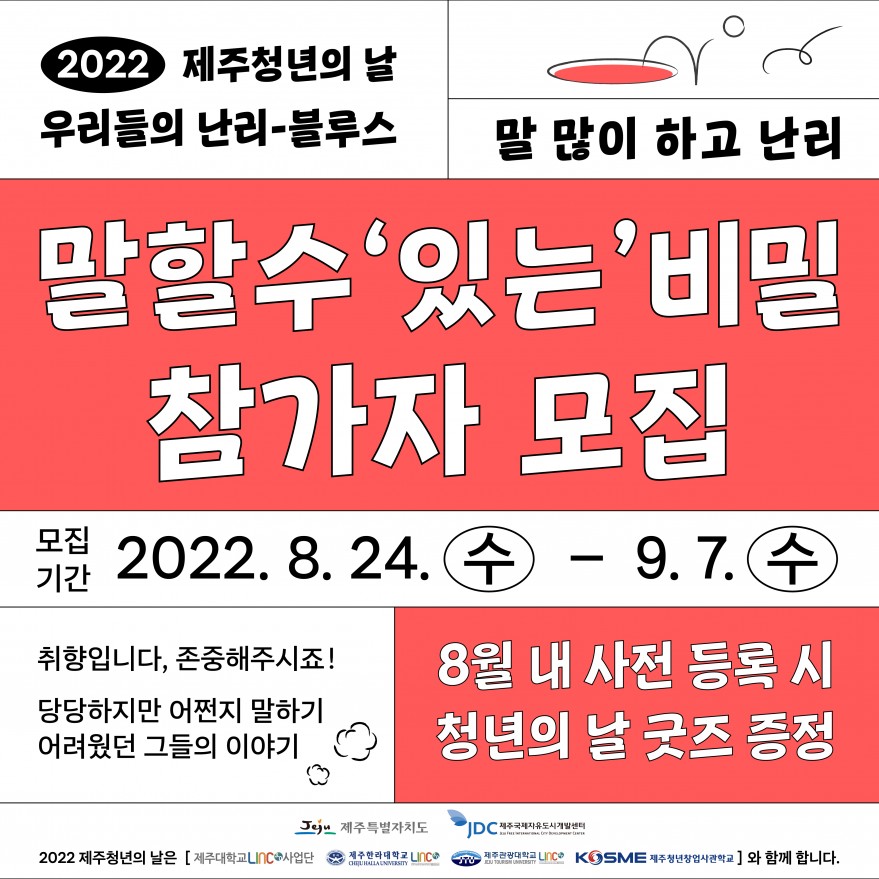 8월 사전등록시 청년의 날 굿즈가! 말할수있는비밀 참가자 모집 중(~9/7) 페이지 정보 작성자 kOOOOg 작성일22-08-30 11:14 조회5,058회 연락처 010-6587-2426 관련링크 본문 ☎️문의처 : 제주청년의 날 운영사무국 064. 727. 0521 이전글 다음글 목록
