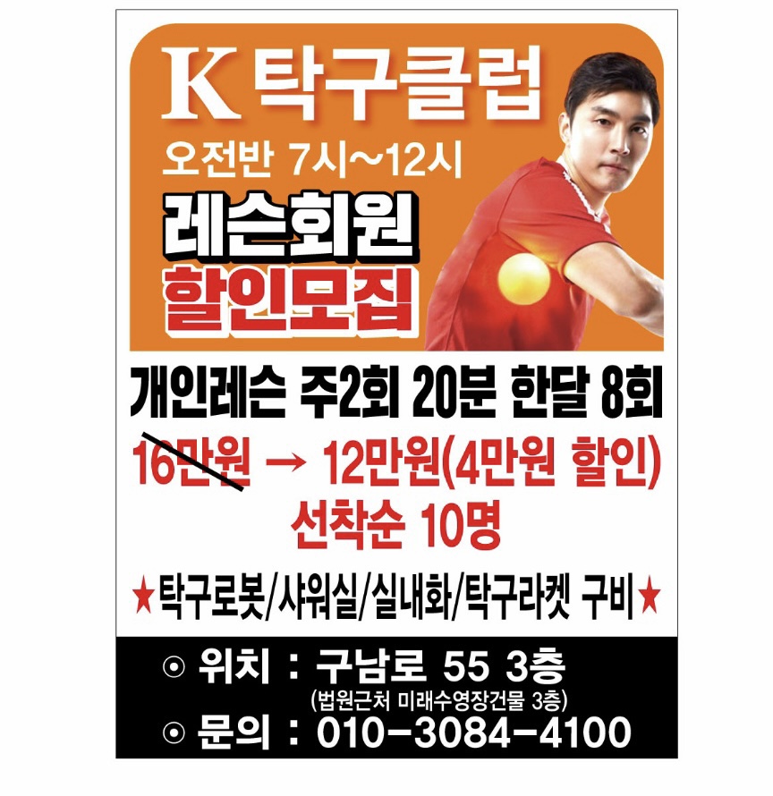 탁구 개인레슨 4만원 할인행사중입니다, 페이지 정보 작성자 개OO나 작성일21-12-30 17:45 조회4,863회 연락처 010-3084-4100 관련링크 본문 . 이전글 다음글 목록