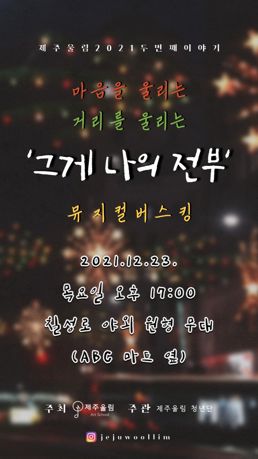 버스킹 공연합니다!! 페이지 정보 작성자 제OO림 작성일21-12-21 11:02 조회4,901회 연락처 010-6282-1453 관련링크 본문 제주울림 청년단에서 뮤지컬 버스킹 공연을 합니다!!'2021년 12월 23일 목요일 오후 5시'오셔서 힐링 받고 가세요 이전글 다음글 목록
