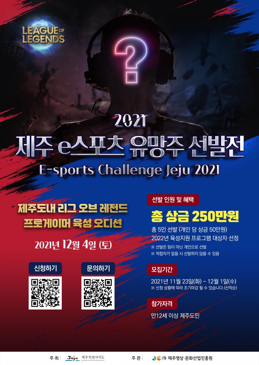 2021 제주 e스포츠 유망주 선발전은 제주도내 프로게이머 육성을 위해 개최되는 오디션 대회입니다.