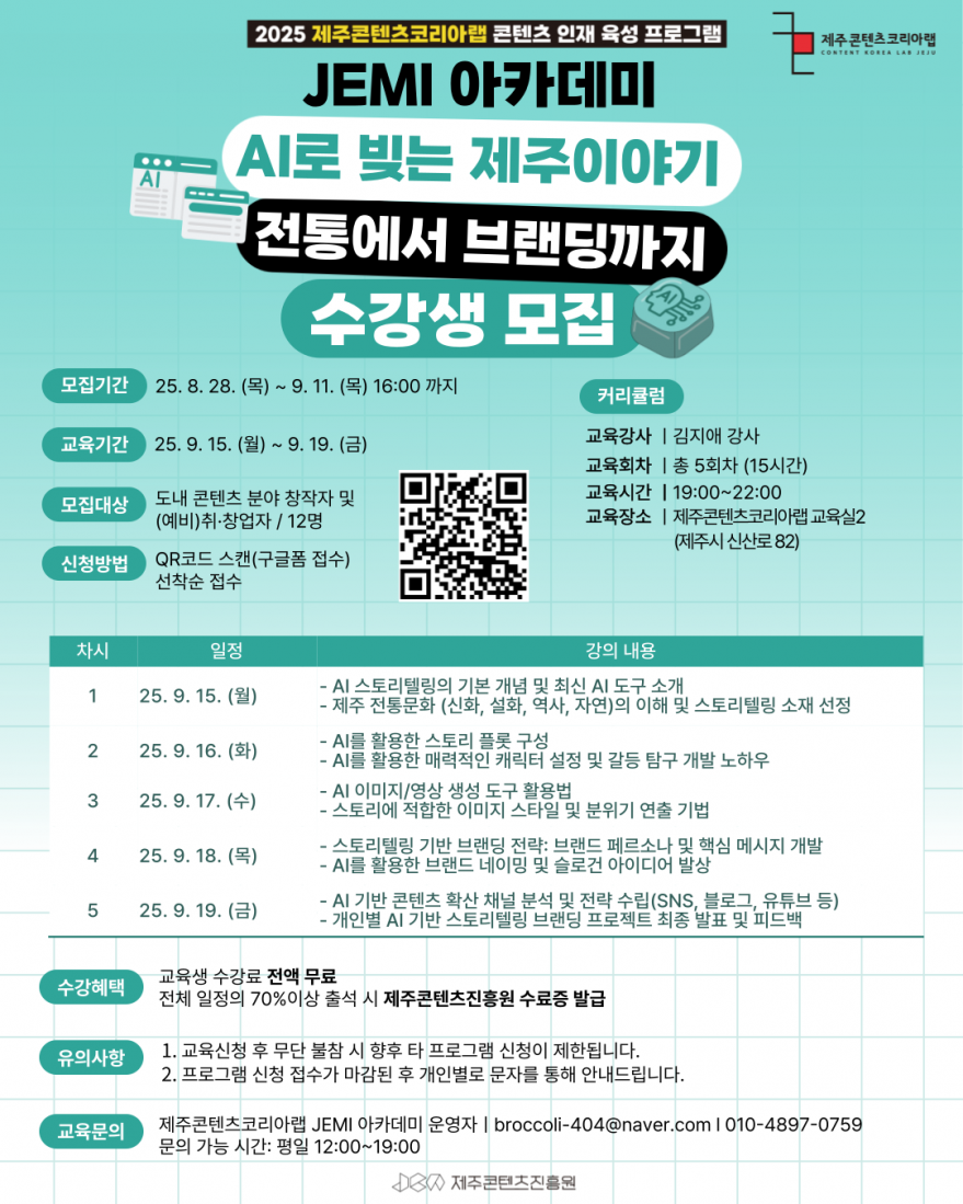 ▸ 참여혜택: 교육생 수강료 전액 무료, 제주콘텐츠진흥원 수료증 발급 (70% 이상 출석 시)