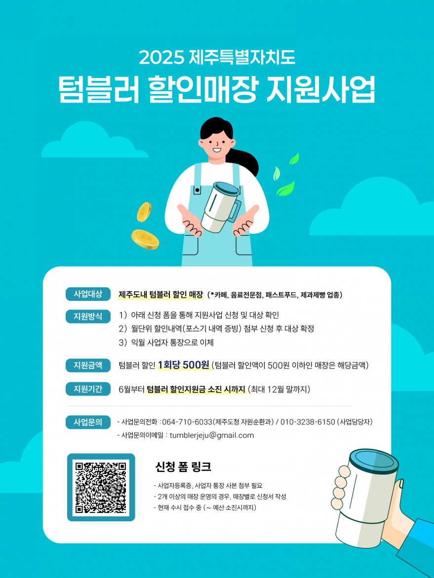 제주도가 텀블러를 사용하는 소비자에게 할인을 제공하는 매장을 지원합니다!